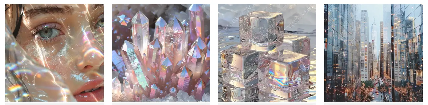 这种风格展现了水晶般透明且现代的艺术风格,包含水晶、冰块、人物肖像和城市景观等元素。整体色调以透明、淡粉色和银色为主,营造出一种清新、梦幻的氛围。