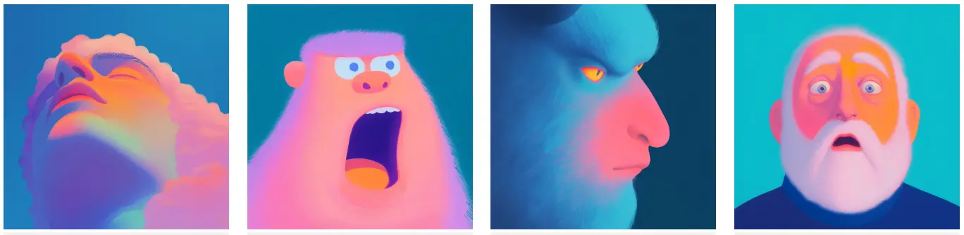这种风格将数字插画与情感表达相结合,灵感来源于夸张的面部表情和卡通艺术。整体色调明亮,以蓝色、粉色和橙色为主,营造出一种俏皮且富有表现力的氛围。