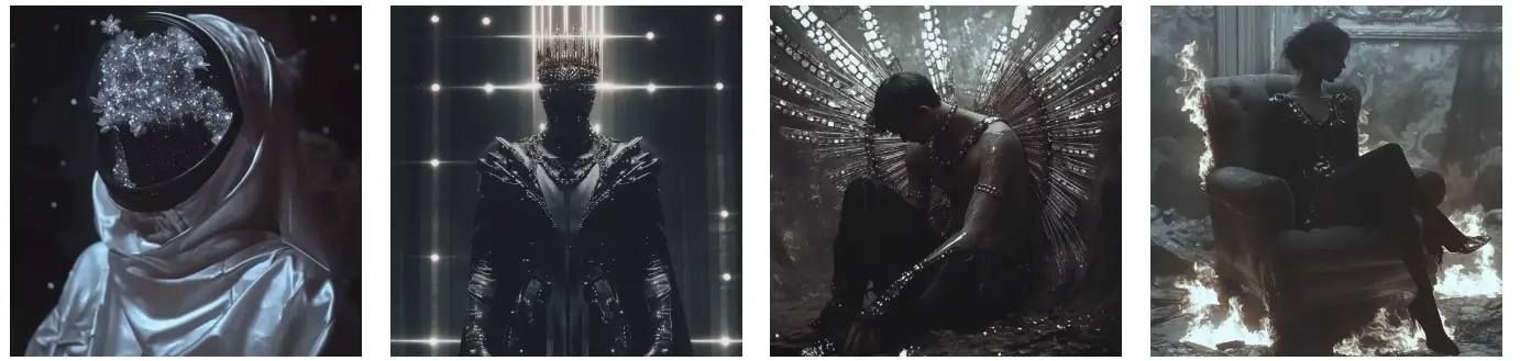 这种风格呈现了未来主义和神秘感,灵感源自科幻与奇幻的结合。整体色调以冷色为主,通过银色和黑色营造出超现实且极具视觉冲击力的氛围。