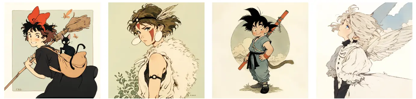 这种风格呈现出一种怀旧且充满童话色彩的艺术风格,融合了经典动画角色和自然元素。整体色调以柔和的米色、浅绿色和复古色调为主,营造出温暖而浪漫的氛围。