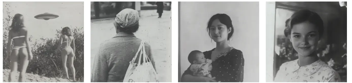 这种风格将怀旧与日常生活相结合,灵感源自20世纪中叶的摄影风格和社会场景。整体以黑白色调为主,营造出经典而真实的感觉。