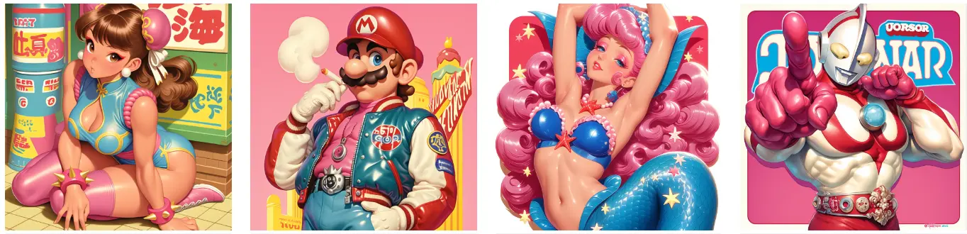 设计技法:将日本动漫的绘画风格与美国漫画的夸张表现相结合,巧妙地融入了经典电子游戏角色。角色以性感的姿态和动态动作呈现,背景采用复古像素艺术风格,形成了一种独特且折衷的混合风格。