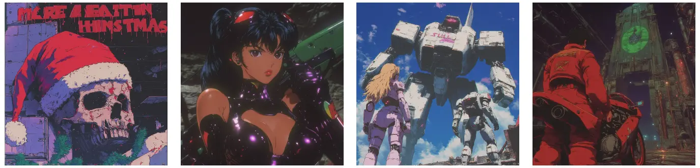 这种风格展现了一种赛博朋克艺术风格,融合了圣诞元素、动漫角色和机甲。画面中使用大胆的色彩和强烈的对比,展现出强烈的未来感和科技感,同时带有一丝堕落和反叛的气息。