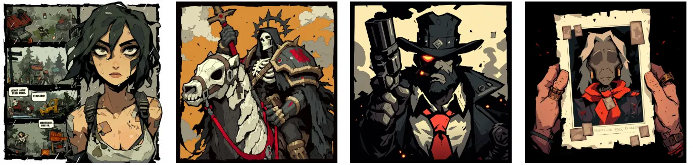 这种风格呈现了一种荒诞且大胆的艺术风格,结合了漫画元素、反乌托邦主题和西部美学。整体色调以鲜艳的橙色和深邃的黑色为主,营造出紧张且充满活力的氛围。