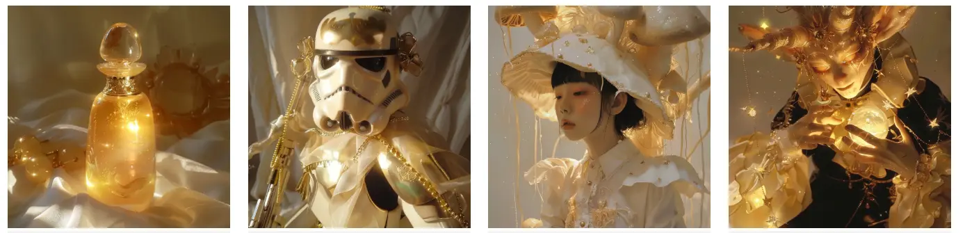 这种风格将奢华与奇幻相结合,融入了金属元素、未来感盔甲和神秘角色。整体色调以金色和白色为主,营造出奢华且神秘的氛围。